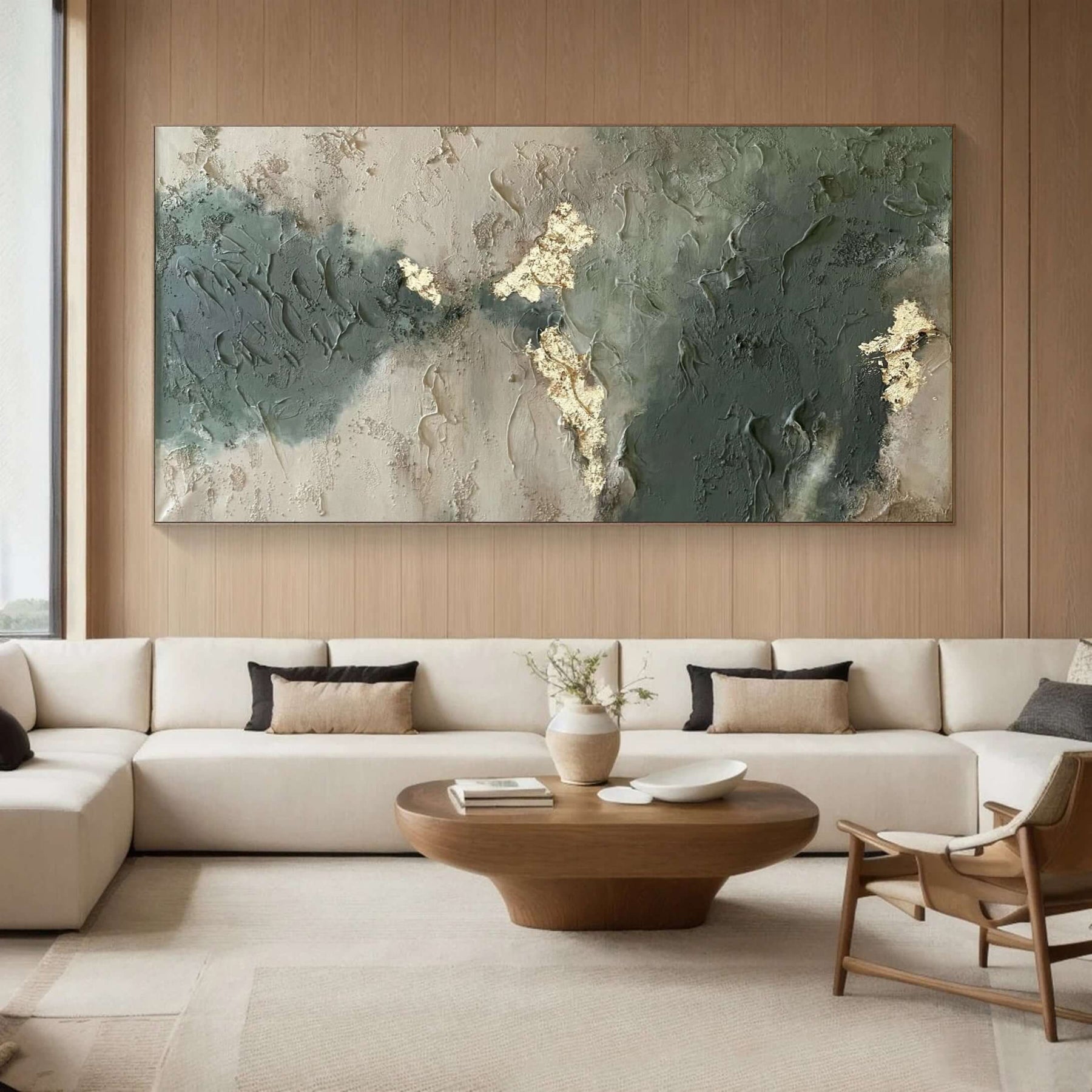 This 100% Pure Hand-Painted Original Oil Painting showcases a subtle blend of textures in a calming palette of sage, beige, and slate. Featuring a Verdant Patina effect and delicate accents of Muted Gilt, this large piece adds an organic, luxurious feel. Guaranteed Hand-Painted Oil Painting for sophisticated spaces.
