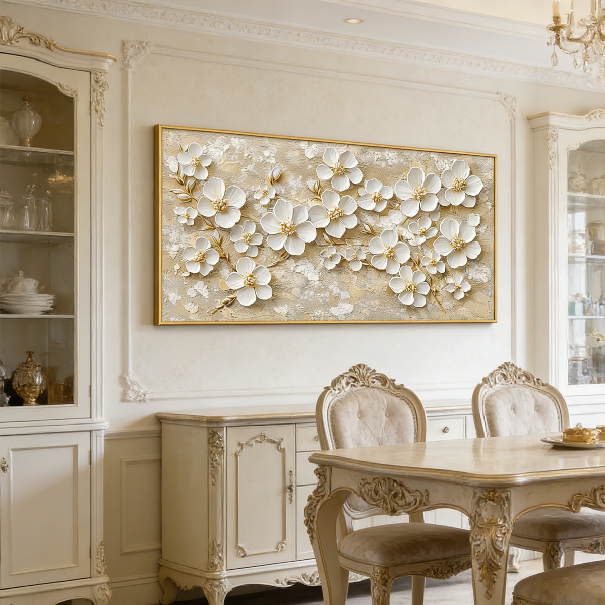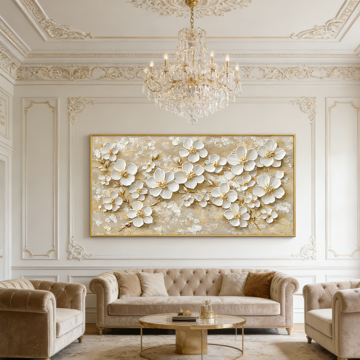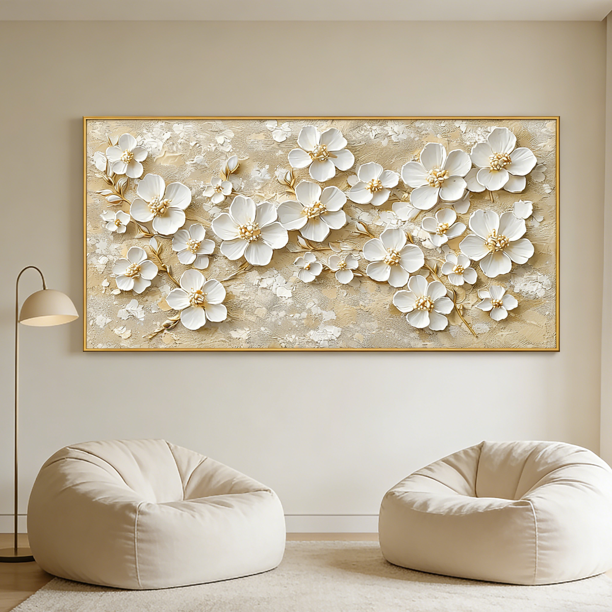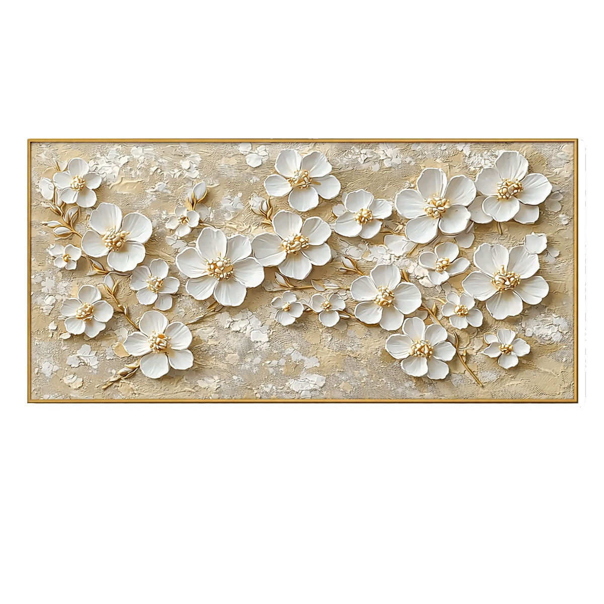 This elegant artwork features soft white blossoms with golden centers, delicately raised over a warm beige and gold-textured background. The sculptural petals and metallic accents give the piece a refined, luminous presence that brings light and calm to any space.