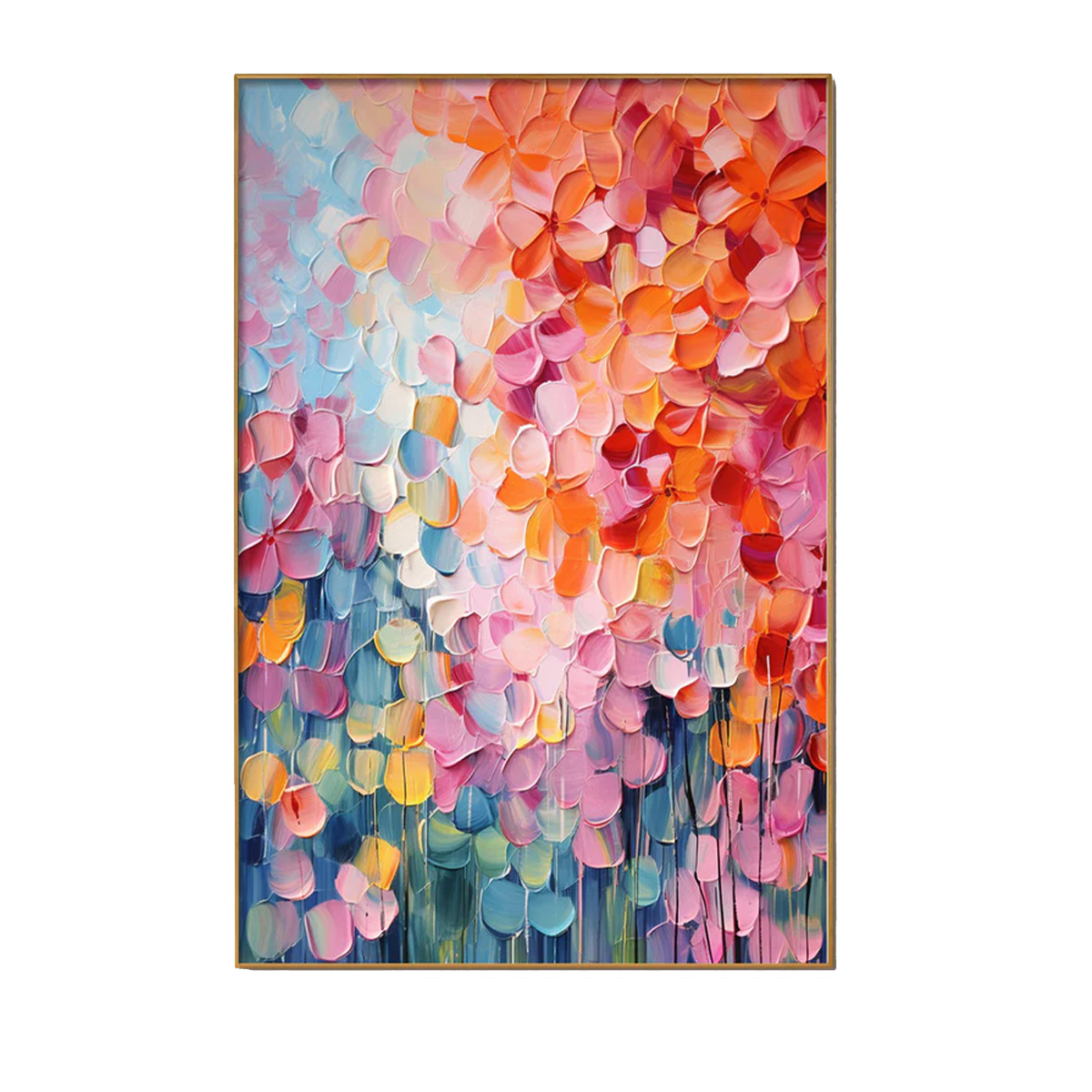 This radiant abstract painting is built from layered, petal-like strokes in coral, blush pink, and sky blue, creating the feeling of flowers gently cascading through light. The rich texture and flowing color transitions give the artwork depth and movement, making it a striking focal point in any modern interior.