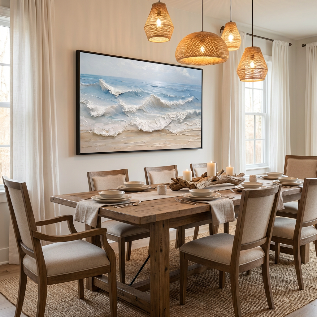 A beautiful statement piece for a living room sofa wall, bedroom, or vacation rental. It fits coastal, Scandinavian, creamy neutral, and modern luxe interiors. The signature beach palette-knife grain and 3D seafoam edges cast gentle shadows in side lighting, enhancing depth and realism without overwhelming the space.