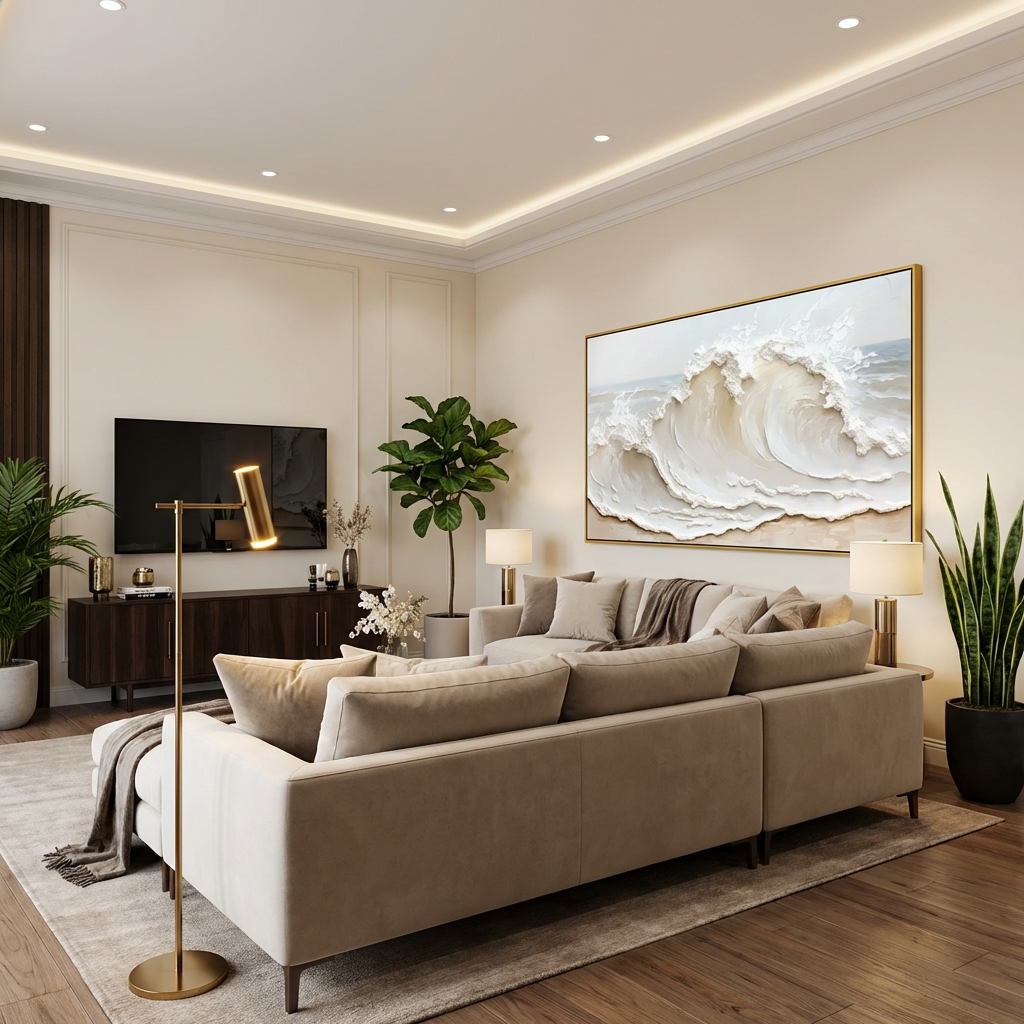 This piece works beautifully as elegant white coastal wall art, perfect for beach houses, modern apartments, or luxury interiors. Its rich surface and flowing movement also make it a stunning textured wave painting, offering depth, light, and a sense of motion that transforms any space.